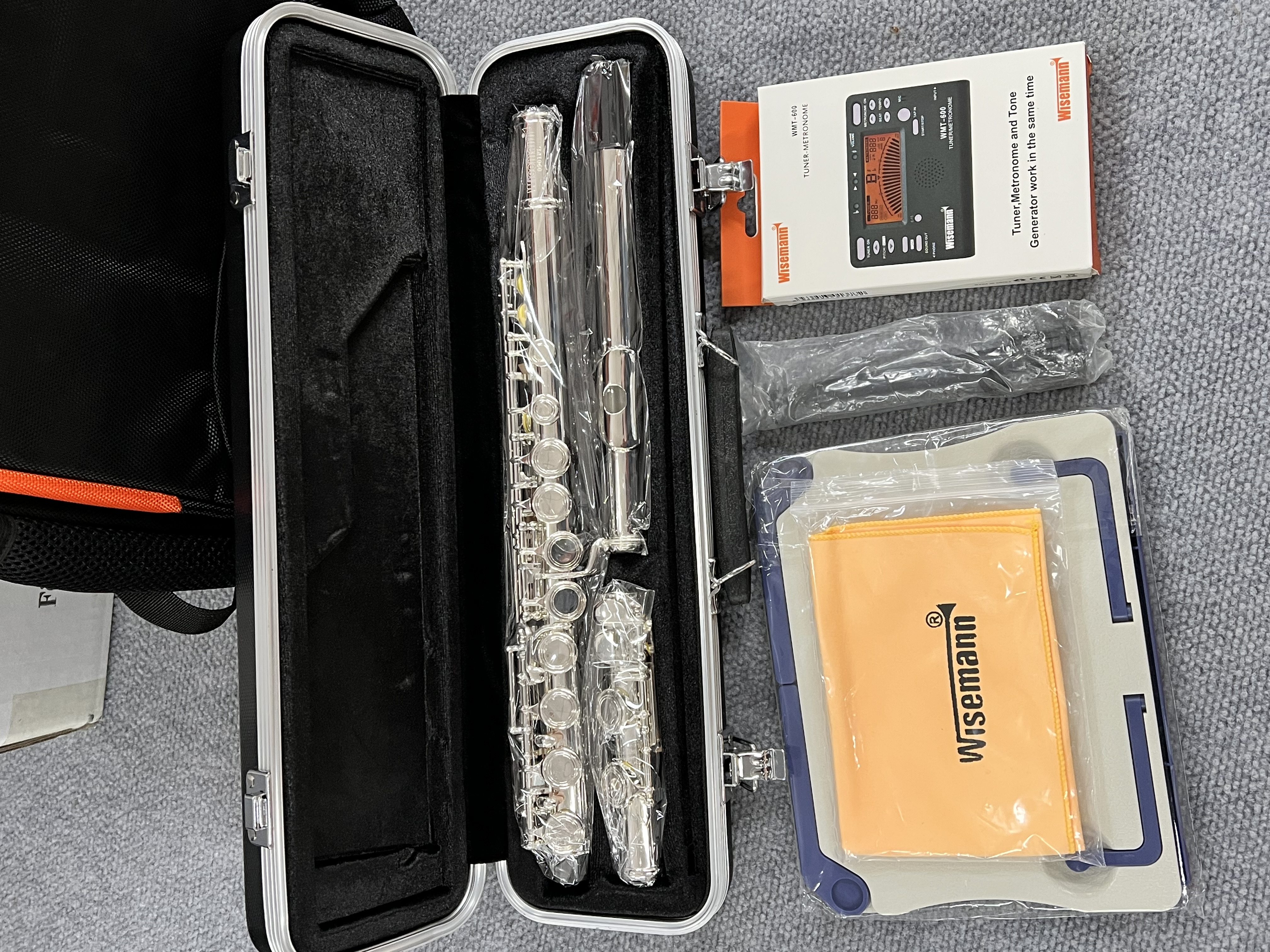 WISEMANN TAURUS FLUTE KIT, SILVER PLATED FINISH, 16 HOLES, INCLUDES WISEMANN ABS FLUTE CASE, BACKPACK BAG, DIGITAL TUNER, TABLE MUSIC STAND, FLUTE STAND, CARE KIT.